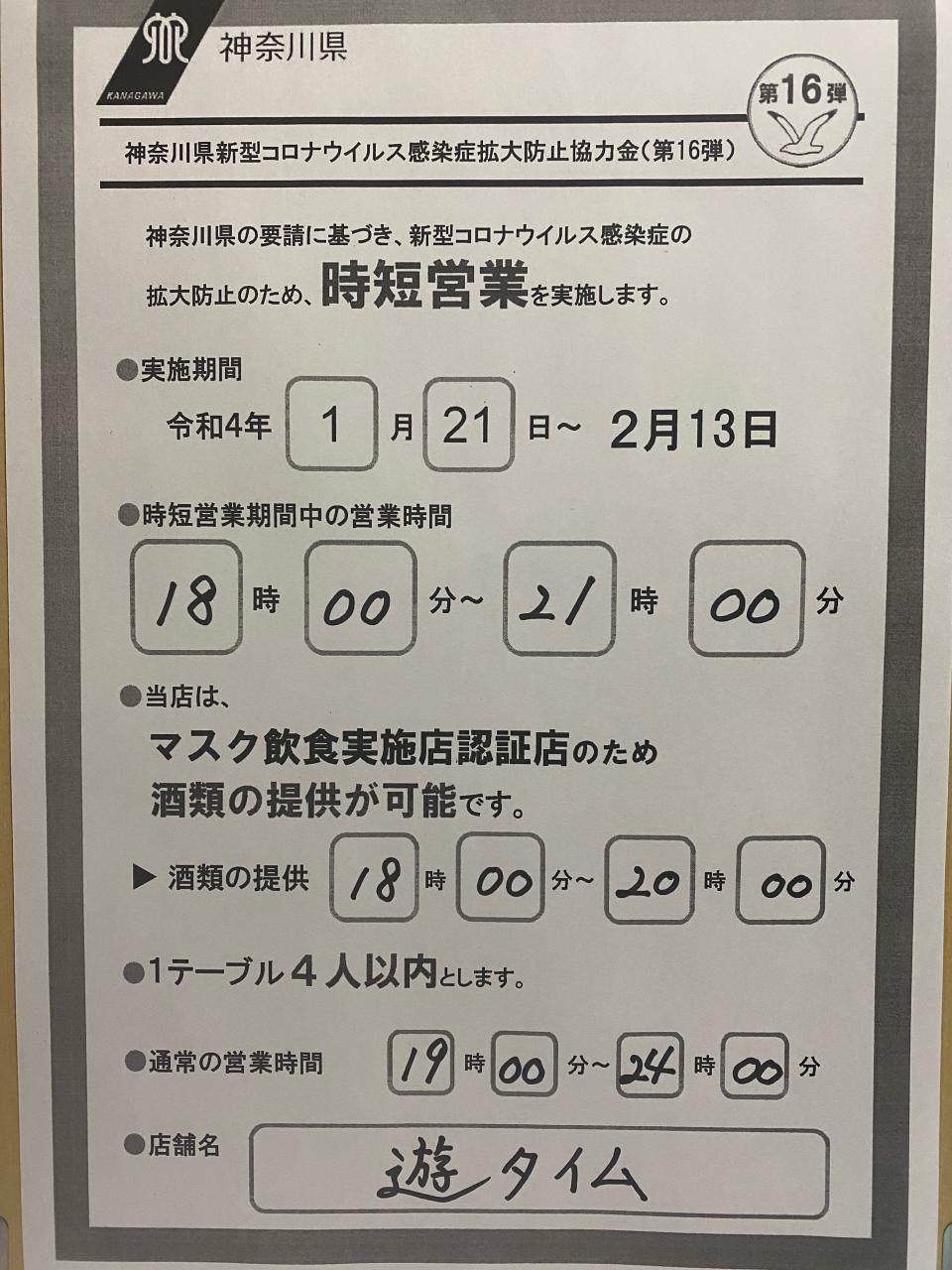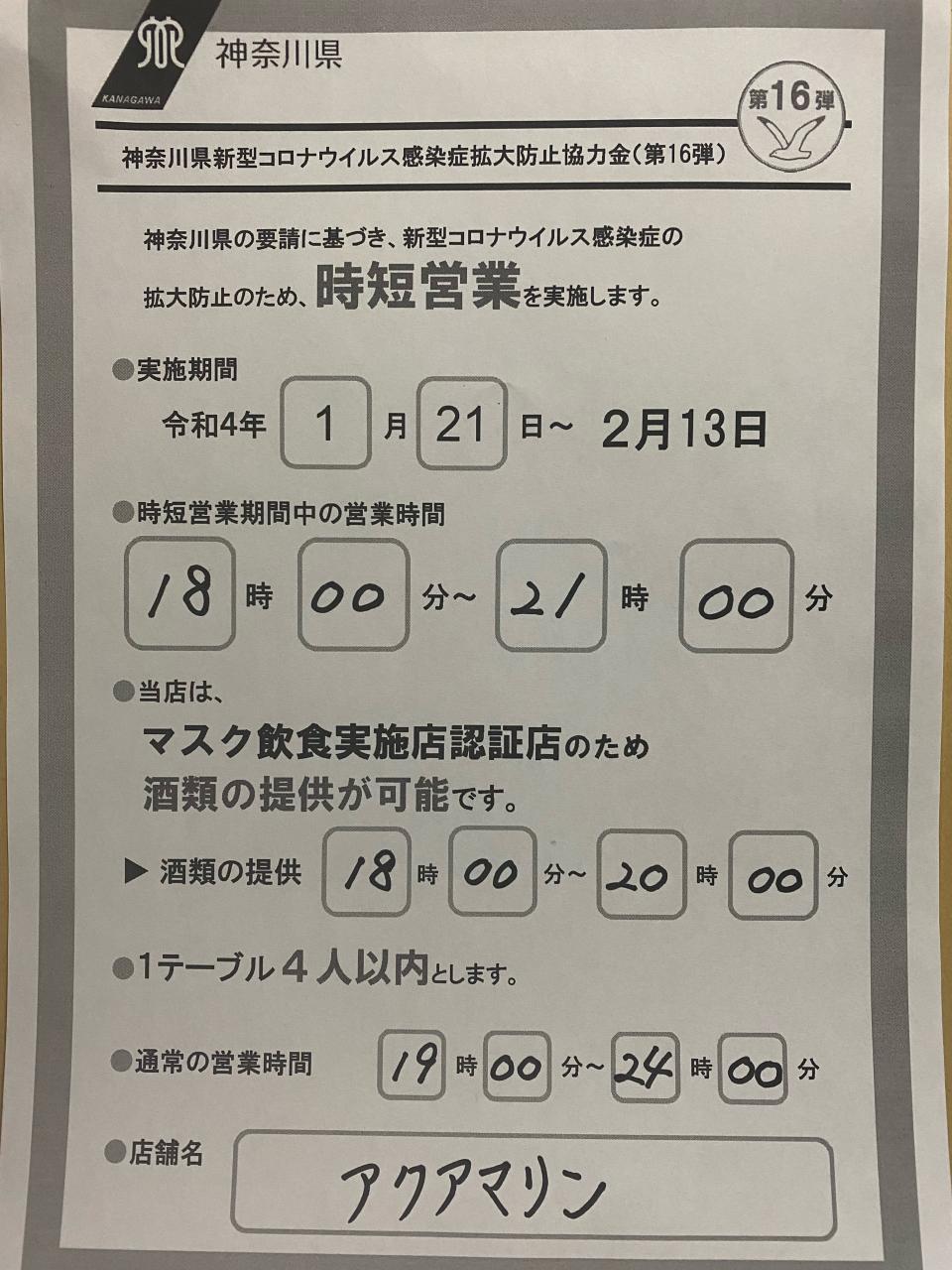 AQUA MARINE・遊タイムともに本日の営業は、臨時休業とさせていただきます。また、明日1/25〜2/13まで遊タイムを休業とし、AQUA MARINEでの合同営業(時短営業)に変更となります。皆様にはご迷惑をおかけしますが、ご理解・ご協力のほど何卒宜しくお願い致します。